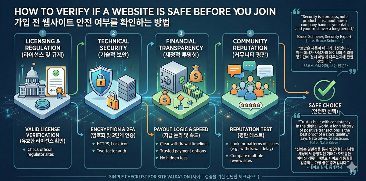 가입 전 웹사이트가 안전한지 확인하는 방법은 매우 중요한 과정입니다. 특히 돈이 오가는 온라인 활동을 위해 사이트를 선택할 때는 신중한 생각이 필요합니다. 많은 사람이 큰 보너스나 화려한 광고 때문에 서둘러 가입하지만, 가장 현명한 사용자는 개인 정보를 공유하기 전에 엄격한 체크리스트를 따릅니다. 이러한 과정은 위험한 추측을 스마트하고 데이터에 기반한 선택으로 바꾸어 줍니다.
